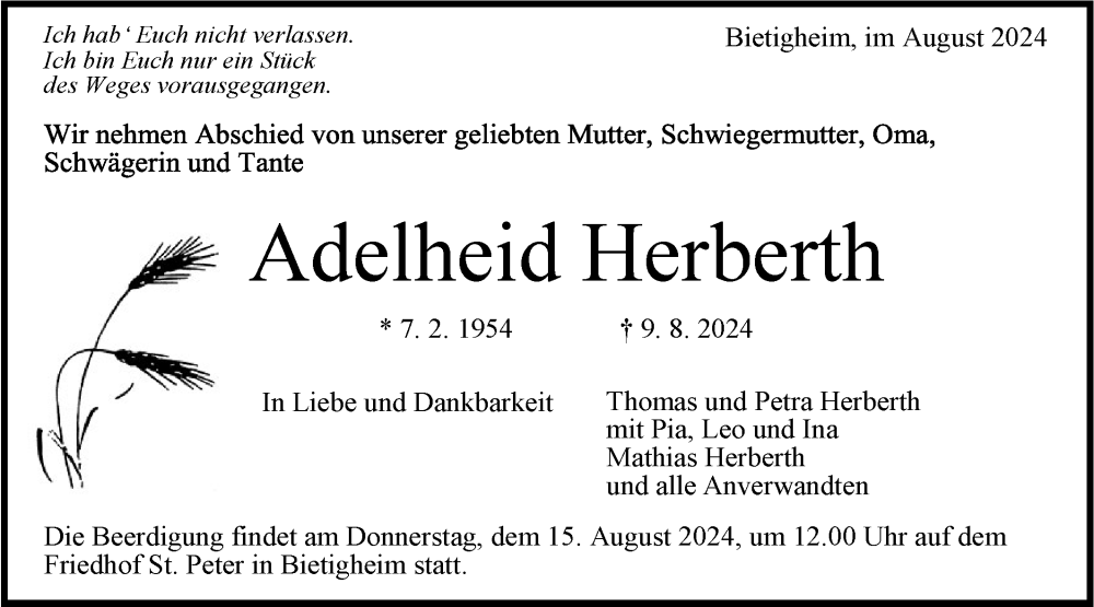 Hier finden Sie alle Traueranzeigen aus der Zeitung, die bisher für Adelheid Herberth erschienen sind. Weitere Traueranzeigen, die in der Zeitung erscheinen, werden hier ebenfalls aufgelistet