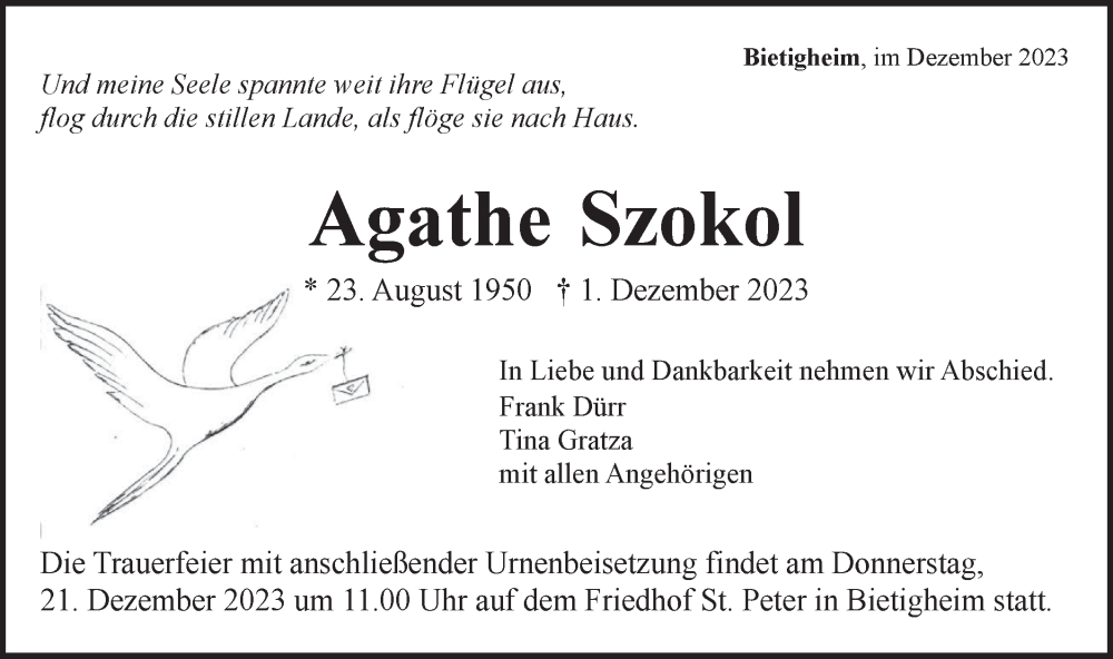 Hier finden Sie alle Traueranzeigen aus der Zeitung, die bisher für Agathe Szokol erschienen sind. Weitere Traueranzeigen, die in der Zeitung erscheinen, werden hier ebenfalls aufgelistet