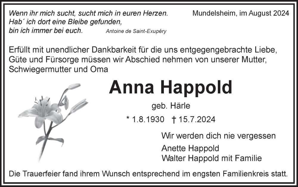 Hier finden Sie alle Traueranzeigen aus der Zeitung, die bisher für Anna Happold erschienen sind. Weitere Traueranzeigen, die in der Zeitung erscheinen, werden hier ebenfalls aufgelistet