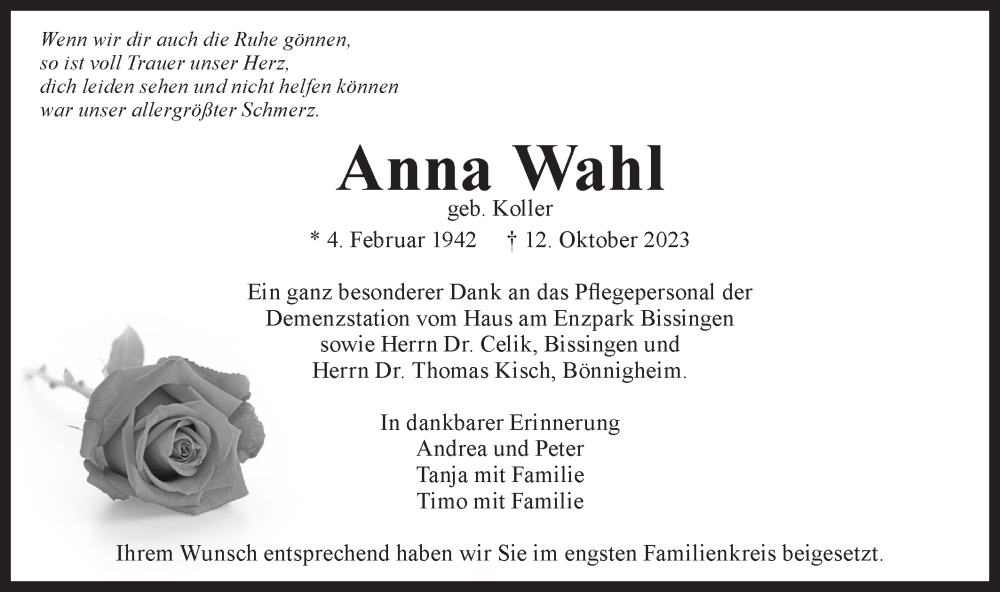 Hier finden Sie alle Traueranzeigen aus der Zeitung, die bisher für Anna Wahl erschienen sind. Weitere Traueranzeigen, die in der Zeitung erscheinen, werden hier ebenfalls aufgelistet