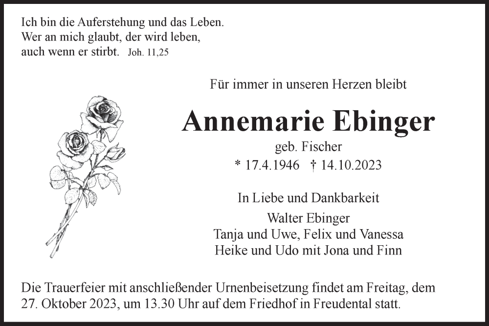 Hier finden Sie alle Traueranzeigen aus der Zeitung, die bisher für Annemarie Ebinger erschienen sind. Weitere Traueranzeigen, die in der Zeitung erscheinen, werden hier ebenfalls aufgelistet