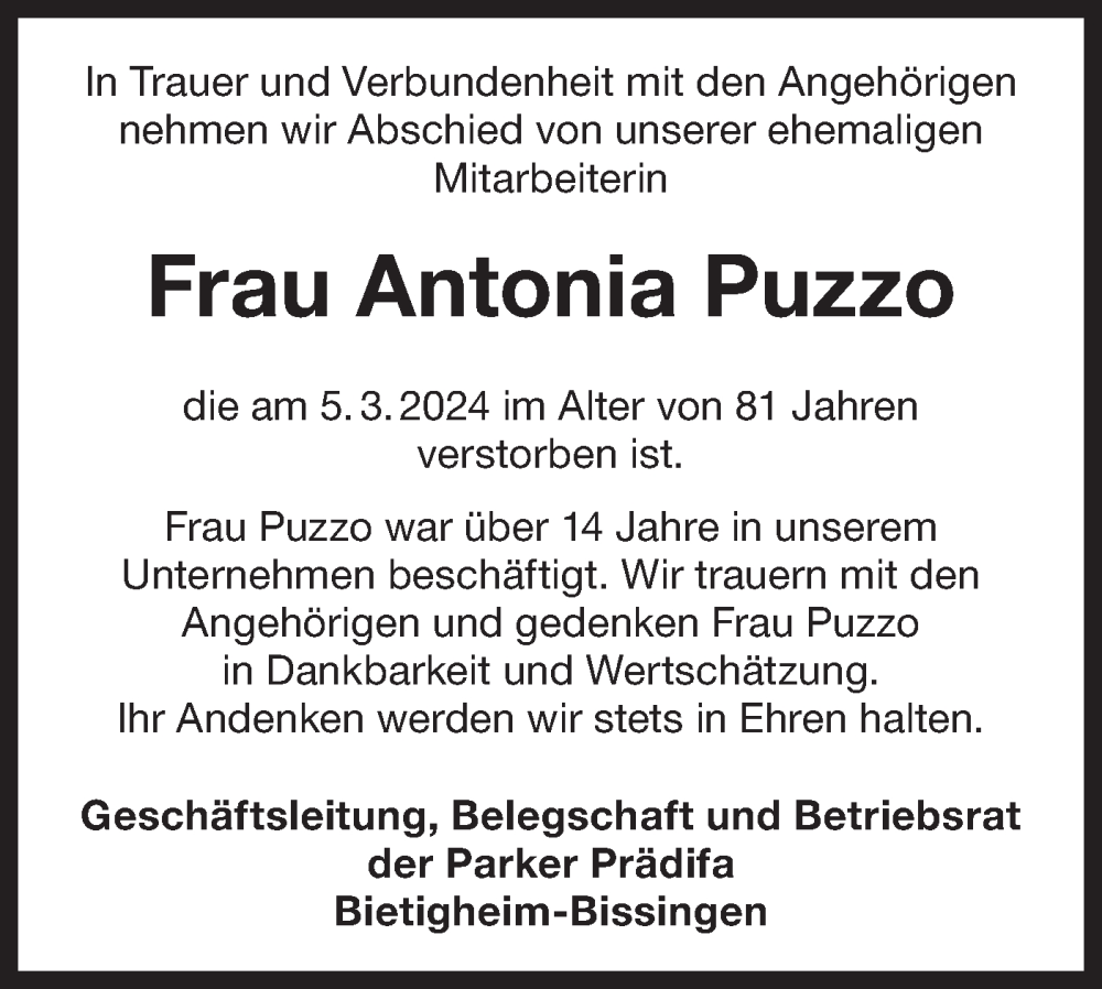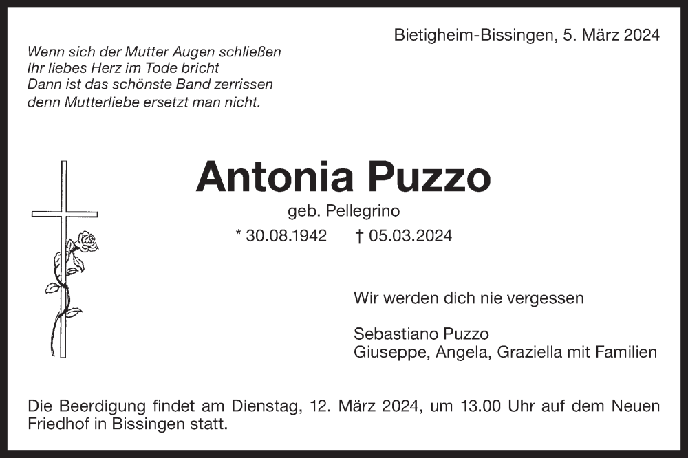 Hier finden Sie alle Traueranzeigen aus der Zeitung, die bisher für Antonia Puzzo erschienen sind. Weitere Traueranzeigen, die in der Zeitung erscheinen, werden hier ebenfalls aufgelistet