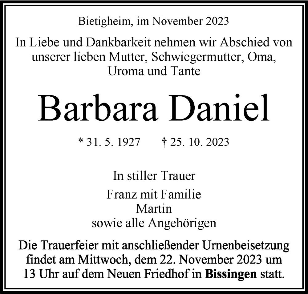 Hier finden Sie alle Traueranzeigen aus der Zeitung, die bisher für Barbara Daniel erschienen sind. Weitere Traueranzeigen, die in der Zeitung erscheinen, werden hier ebenfalls aufgelistet
