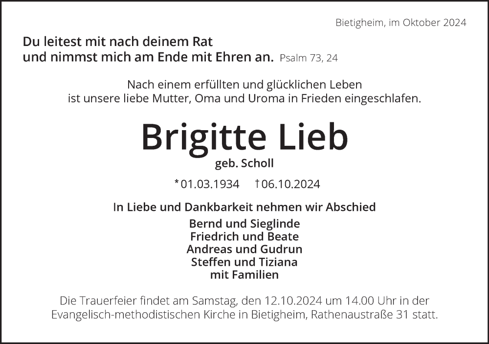 Hier finden Sie alle Traueranzeigen aus der Zeitung, die bisher für Brigitte Lieb erschienen sind. Weitere Traueranzeigen, die in der Zeitung erscheinen, werden hier ebenfalls aufgelistet