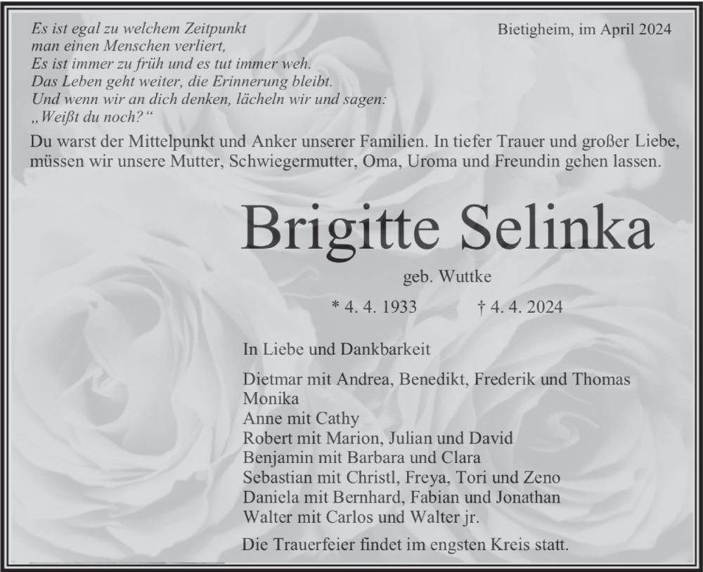 Hier finden Sie alle Traueranzeigen aus der Zeitung, die bisher für Brigitte Selinka erschienen sind. Weitere Traueranzeigen, die in der Zeitung erscheinen, werden hier ebenfalls aufgelistet