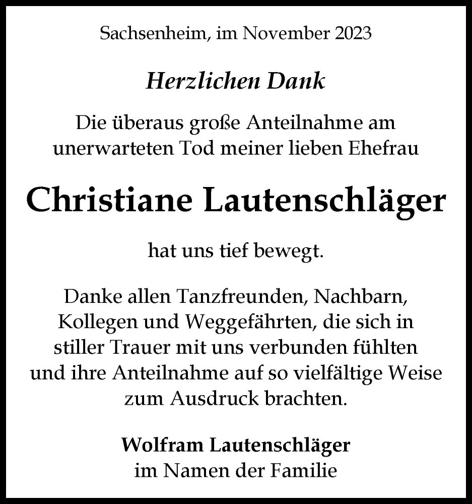 Hier finden Sie alle Traueranzeigen aus der Zeitung, die bisher für Christiane Lautenschläger erschienen sind. Weitere Traueranzeigen, die in der Zeitung erscheinen, werden hier ebenfalls aufgelistet