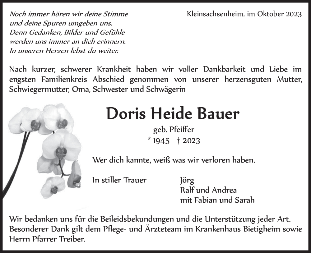 Hier finden Sie alle Traueranzeigen aus der Zeitung, die bisher für Doris Bauer erschienen sind. Weitere Traueranzeigen, die in der Zeitung erscheinen, werden hier ebenfalls aufgelistet
