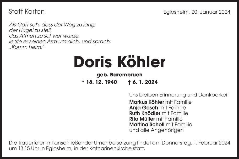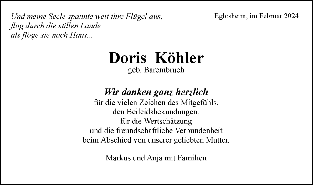 Hier finden Sie alle Traueranzeigen aus der Zeitung, die bisher für Doris Köhler erschienen sind. Weitere Traueranzeigen, die in der Zeitung erscheinen, werden hier ebenfalls aufgelistet