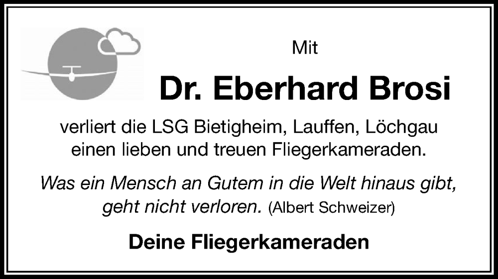 Hier finden Sie alle Traueranzeigen aus der Zeitung, die bisher für Eberhard Brosi erschienen sind. Weitere Traueranzeigen, die in der Zeitung erscheinen, werden hier ebenfalls aufgelistet