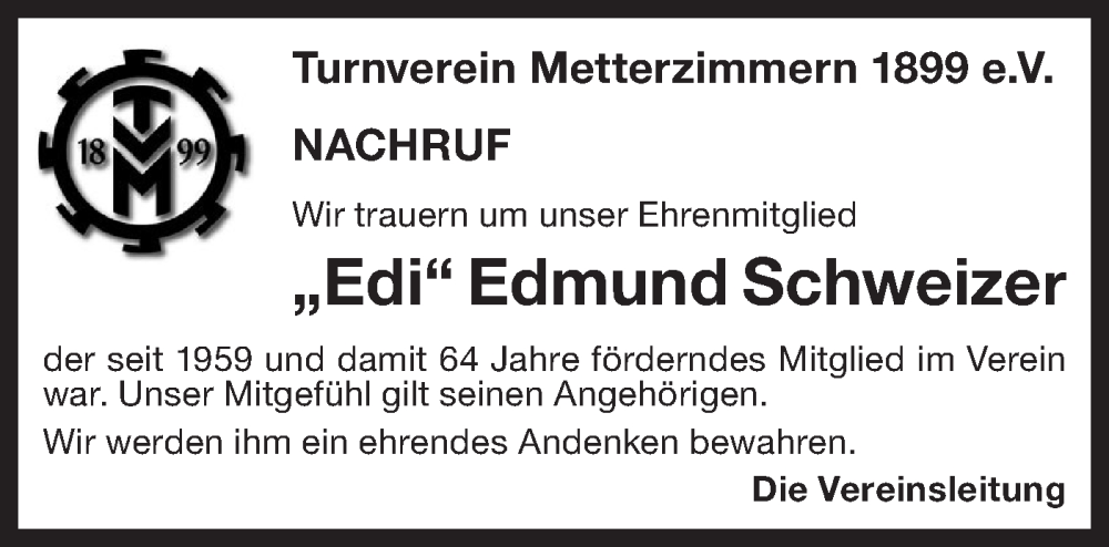 Hier finden Sie alle Traueranzeigen aus der Zeitung, die bisher für Edmund Schweizer erschienen sind. Weitere Traueranzeigen, die in der Zeitung erscheinen, werden hier ebenfalls aufgelistet