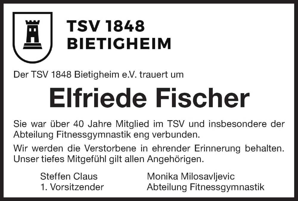 Hier finden Sie alle Traueranzeigen aus der Zeitung, die bisher für Elfriede Fischer erschienen sind. Weitere Traueranzeigen, die in der Zeitung erscheinen, werden hier ebenfalls aufgelistet