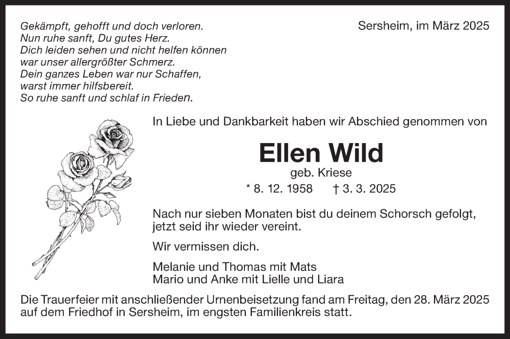 Hier finden Sie alle Traueranzeigen aus der Zeitung, die bisher für Ellen Wild erschienen sind. Weitere Traueranzeigen, die in der Zeitung erscheinen, werden hier ebenfalls aufgelistet