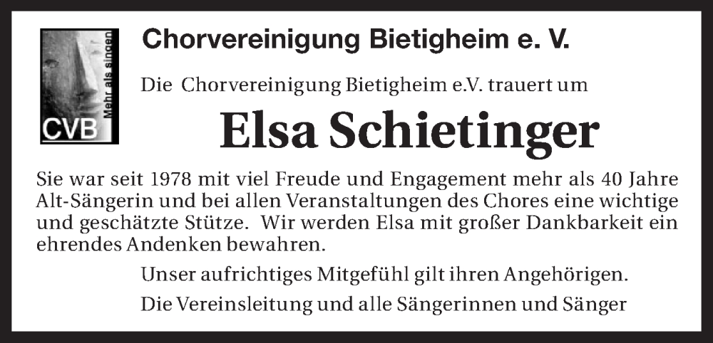 Hier finden Sie alle Traueranzeigen aus der Zeitung, die bisher für Elsa Schietinger erschienen sind. Weitere Traueranzeigen, die in der Zeitung erscheinen, werden hier ebenfalls aufgelistet