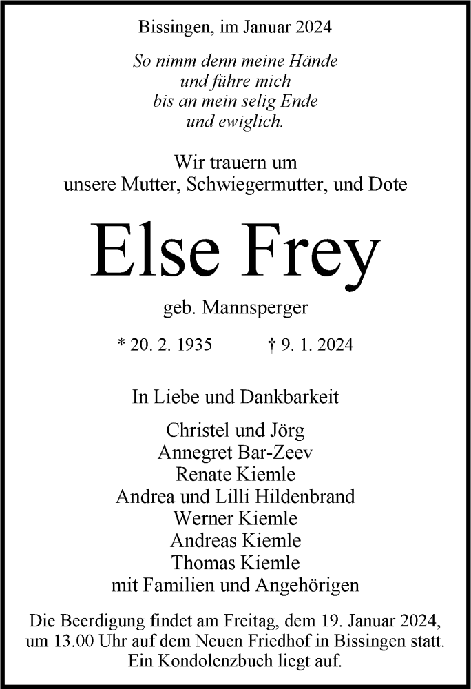 Hier finden Sie alle Traueranzeigen aus der Zeitung, die bisher für Else Frey erschienen sind. Weitere Traueranzeigen, die in der Zeitung erscheinen, werden hier ebenfalls aufgelistet