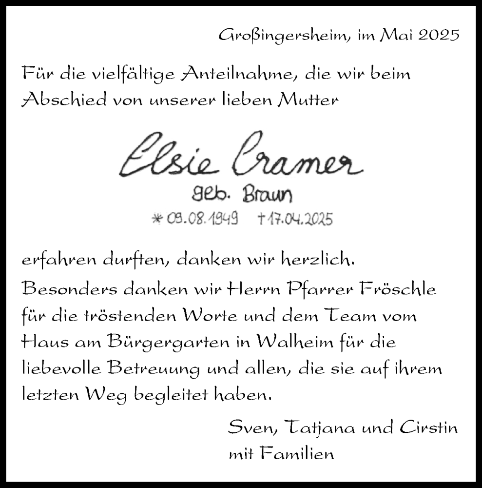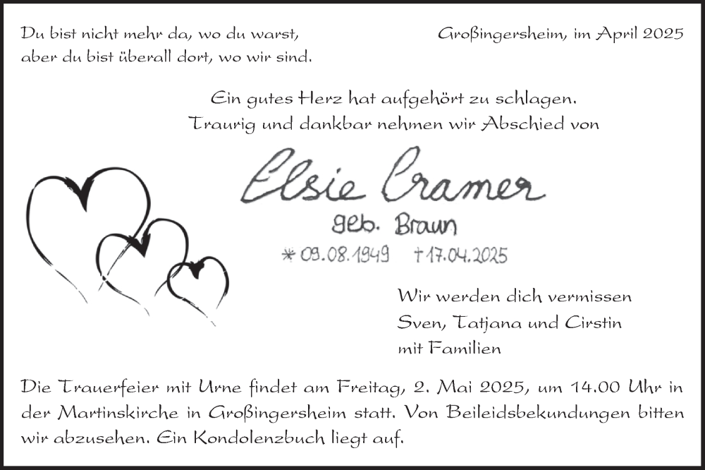 Hier finden Sie alle Traueranzeigen aus der Zeitung, die bisher für Elsie Cramer erschienen sind. Weitere Traueranzeigen, die in der Zeitung erscheinen, werden hier ebenfalls aufgelistet