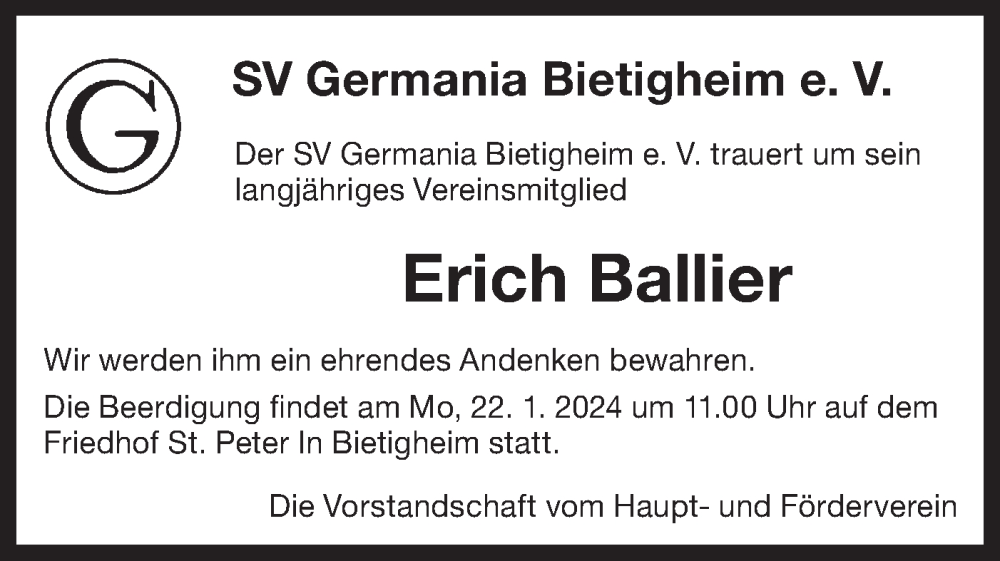 Hier finden Sie alle Traueranzeigen aus der Zeitung, die bisher für Erich Ballier erschienen sind. Weitere Traueranzeigen, die in der Zeitung erscheinen, werden hier ebenfalls aufgelistet