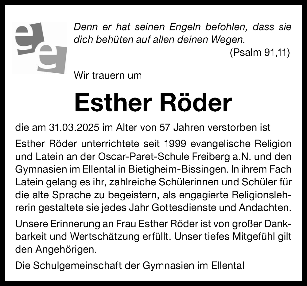 Hier finden Sie alle Traueranzeigen aus der Zeitung, die bisher für Esther Röder erschienen sind. Weitere Traueranzeigen, die in der Zeitung erscheinen, werden hier ebenfalls aufgelistet