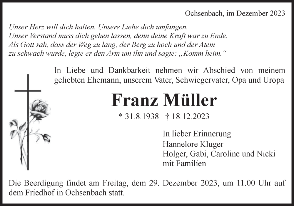 Hier finden Sie alle Traueranzeigen aus der Zeitung, die bisher für Franz Müller erschienen sind. Weitere Traueranzeigen, die in der Zeitung erscheinen, werden hier ebenfalls aufgelistet