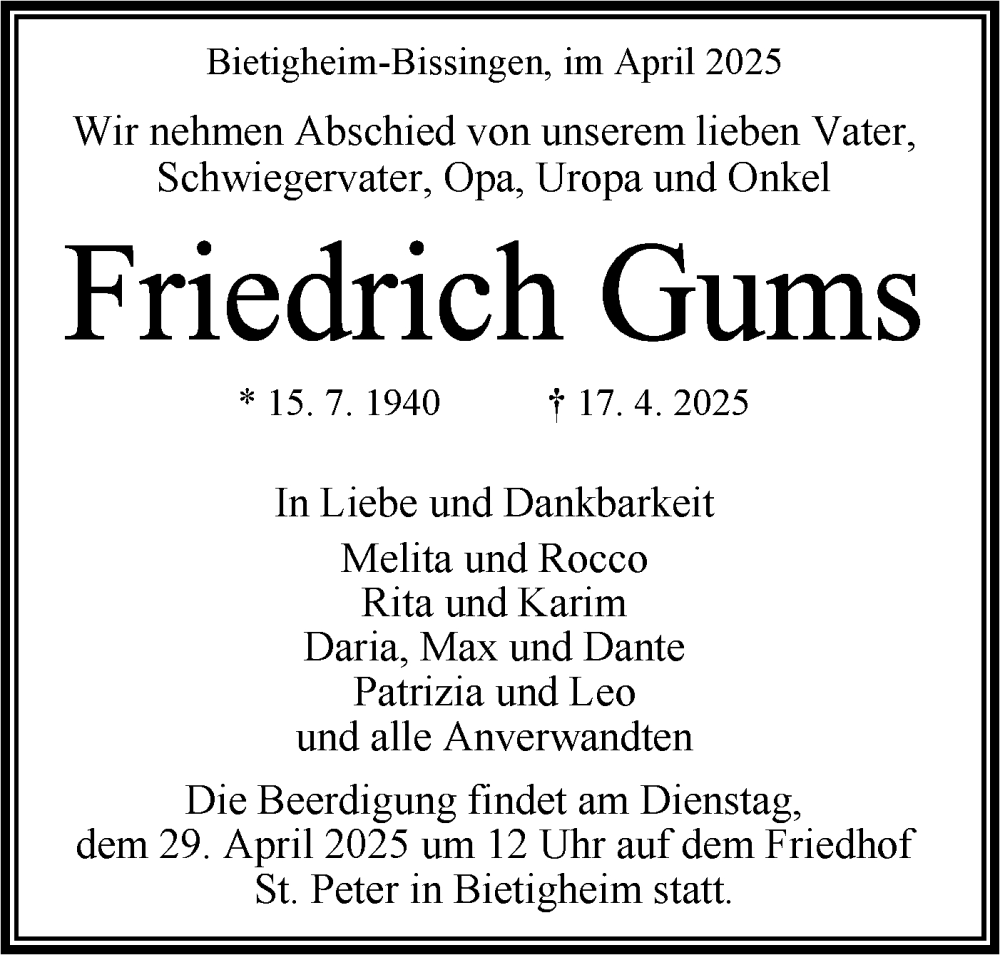 Hier finden Sie alle Traueranzeigen aus der Zeitung, die bisher für Friedrich Gums erschienen sind. Weitere Traueranzeigen, die in der Zeitung erscheinen, werden hier ebenfalls aufgelistet