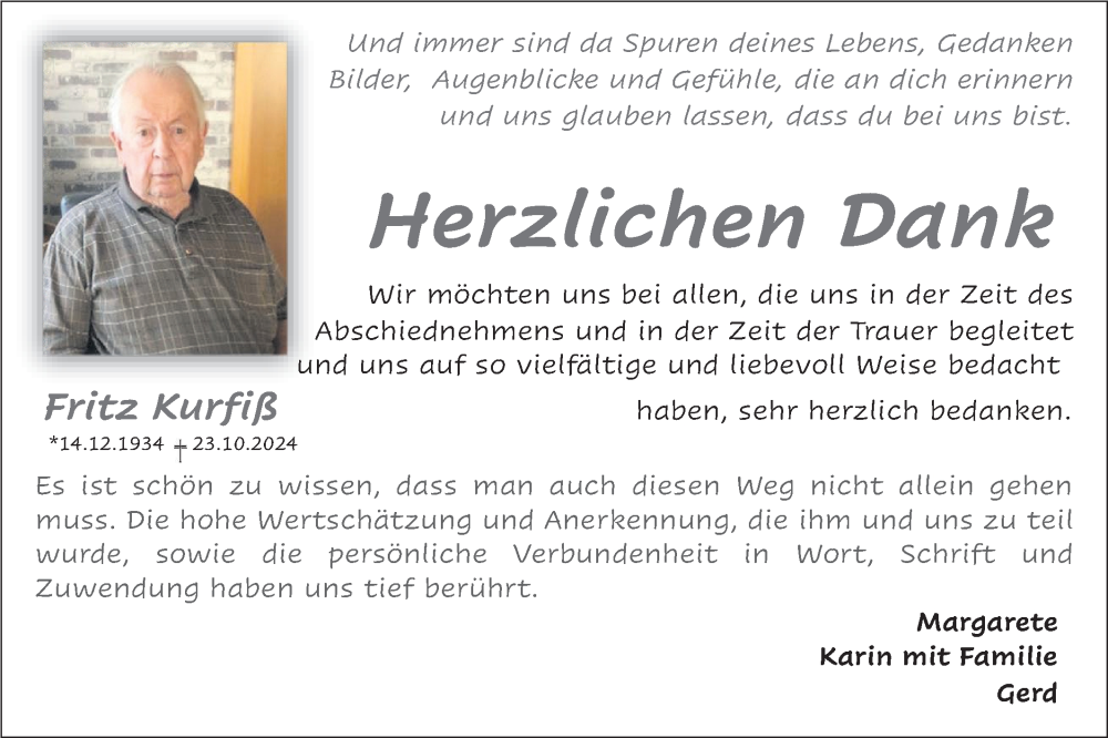 Hier finden Sie alle Traueranzeigen aus der Zeitung, die bisher für Fritz Kurfiß erschienen sind. Weitere Traueranzeigen, die in der Zeitung erscheinen, werden hier ebenfalls aufgelistet