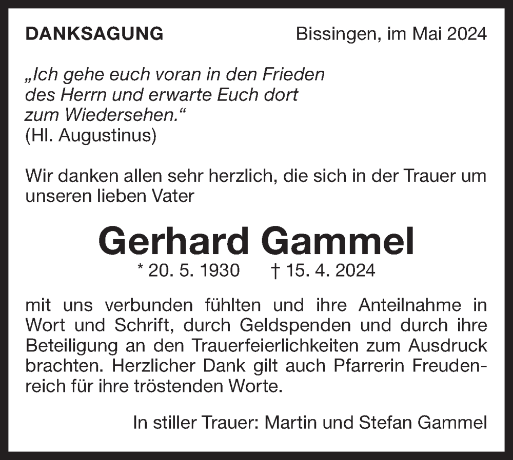 Hier finden Sie alle Traueranzeigen aus der Zeitung, die bisher für Gerhard Gammel erschienen sind. Weitere Traueranzeigen, die in der Zeitung erscheinen, werden hier ebenfalls aufgelistet