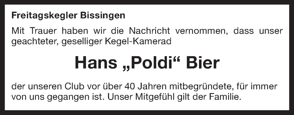Hier finden Sie alle Traueranzeigen aus der Zeitung, die bisher für Hans Bier erschienen sind. Weitere Traueranzeigen, die in der Zeitung erscheinen, werden hier ebenfalls aufgelistet