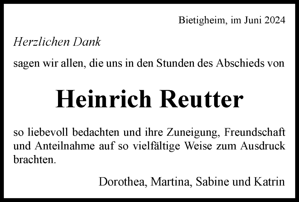 Hier finden Sie alle Traueranzeigen aus der Zeitung, die bisher für Heinrich Reutter erschienen sind. Weitere Traueranzeigen, die in der Zeitung erscheinen, werden hier ebenfalls aufgelistet