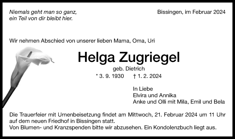 Hier finden Sie alle Traueranzeigen aus der Zeitung, die bisher für Helga Zugriegel erschienen sind. Weitere Traueranzeigen, die in der Zeitung erscheinen, werden hier ebenfalls aufgelistet