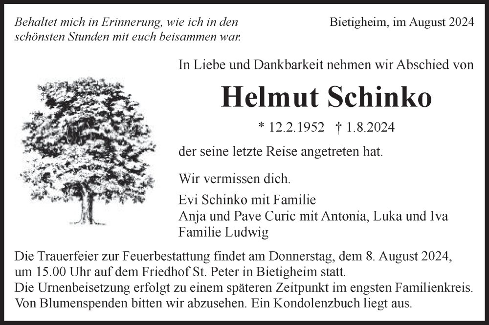 Hier finden Sie alle Traueranzeigen aus der Zeitung, die bisher für Helmut Schinko erschienen sind. Weitere Traueranzeigen, die in der Zeitung erscheinen, werden hier ebenfalls aufgelistet