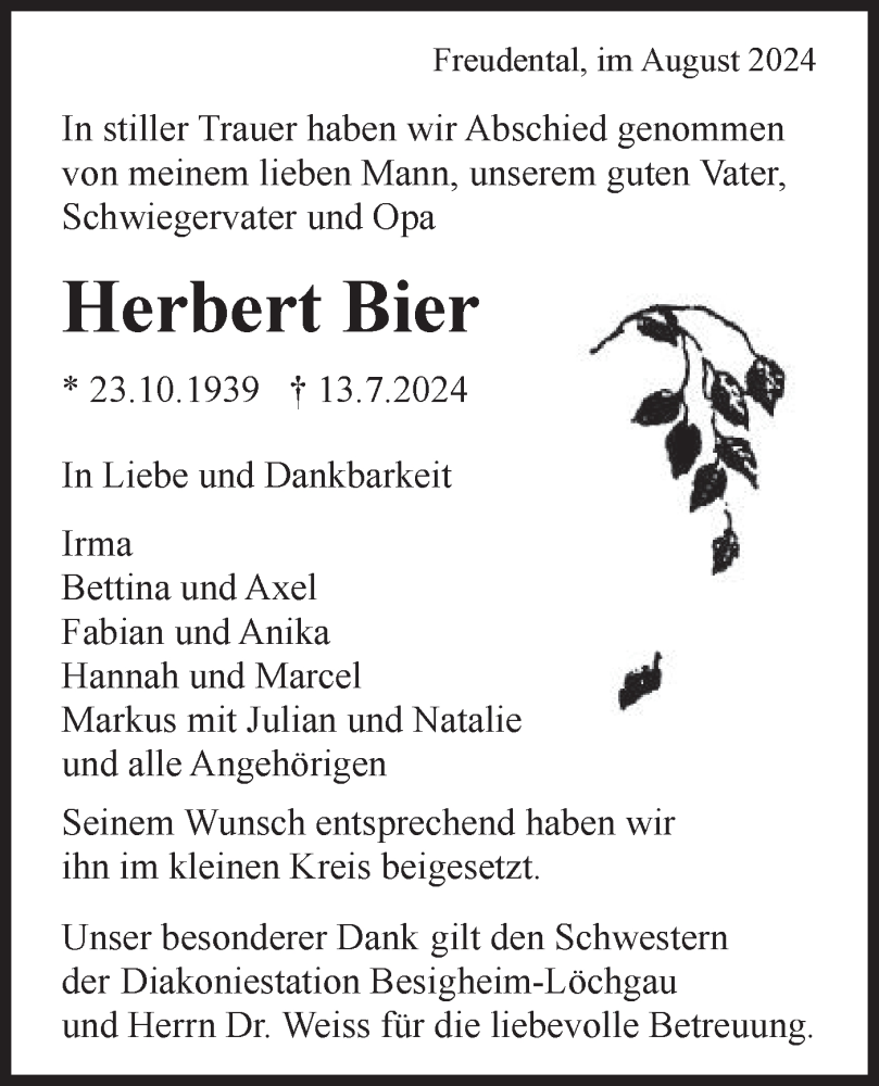 Hier finden Sie alle Traueranzeigen aus der Zeitung, die bisher für Herbert Bier erschienen sind. Weitere Traueranzeigen, die in der Zeitung erscheinen, werden hier ebenfalls aufgelistet