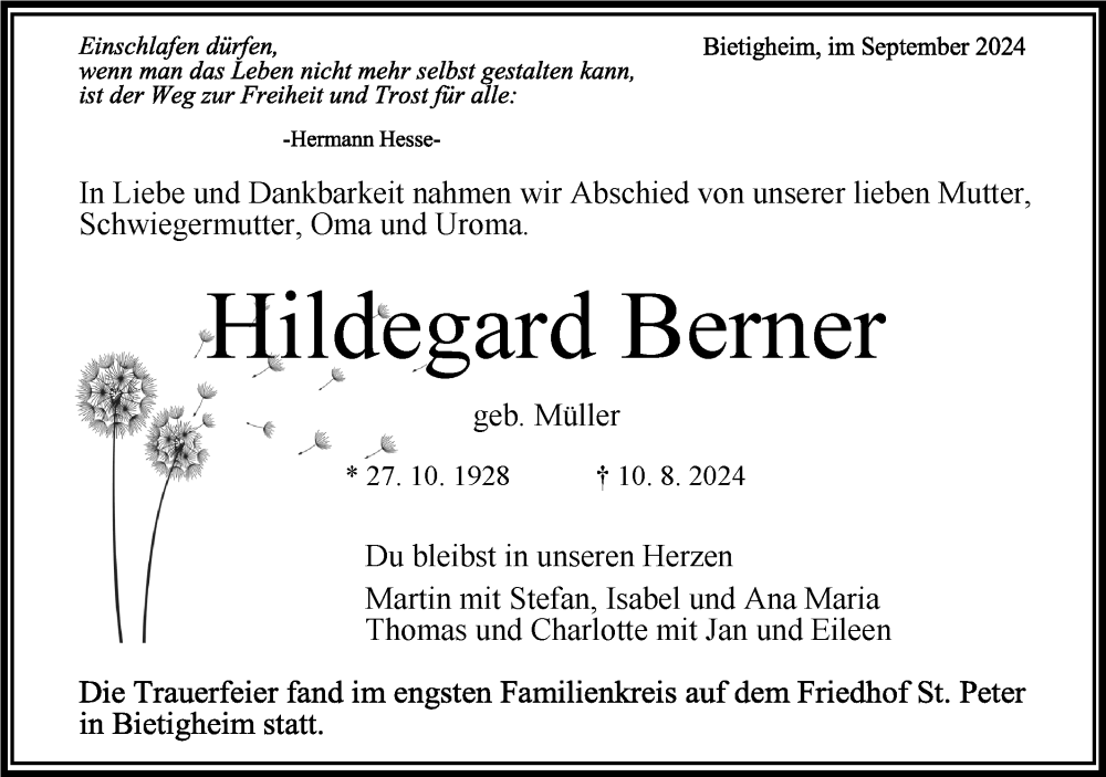 Hier finden Sie alle Traueranzeigen aus der Zeitung, die bisher für Hildegard Berner erschienen sind. Weitere Traueranzeigen, die in der Zeitung erscheinen, werden hier ebenfalls aufgelistet