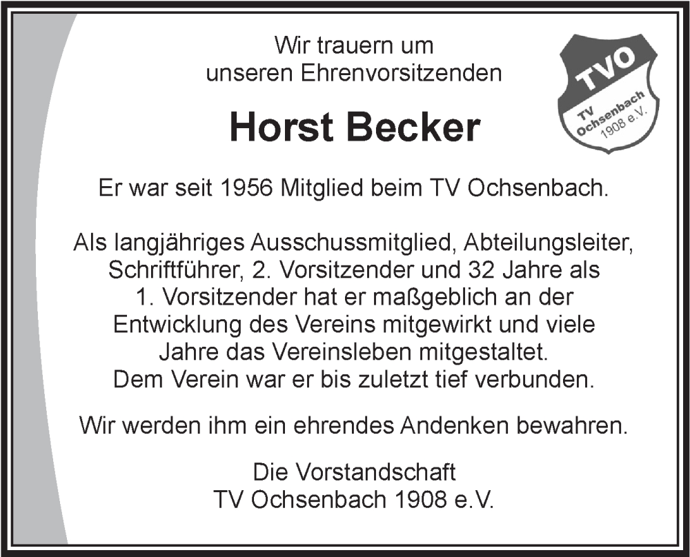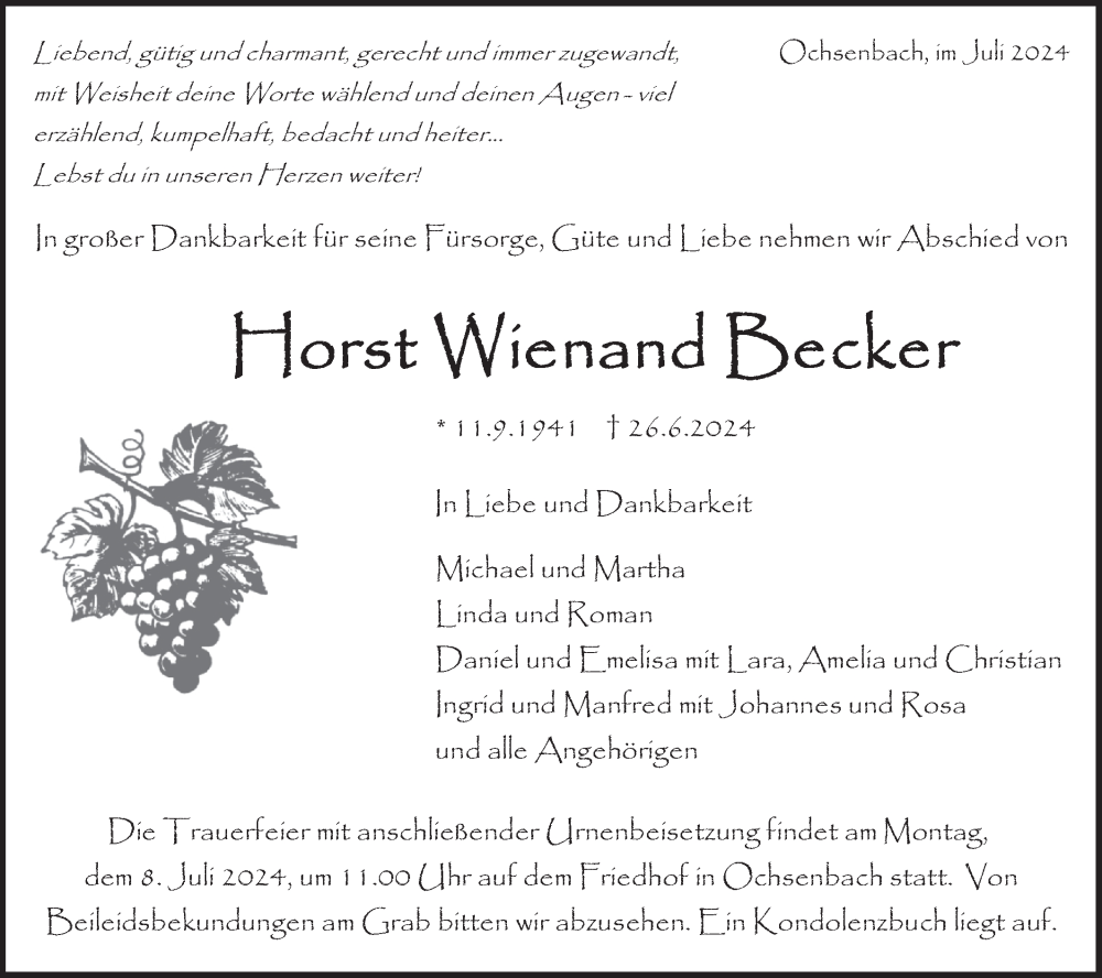 Hier finden Sie alle Traueranzeigen aus der Zeitung, die bisher für Horst Wienand Becker erschienen sind. Weitere Traueranzeigen, die in der Zeitung erscheinen, werden hier ebenfalls aufgelistet