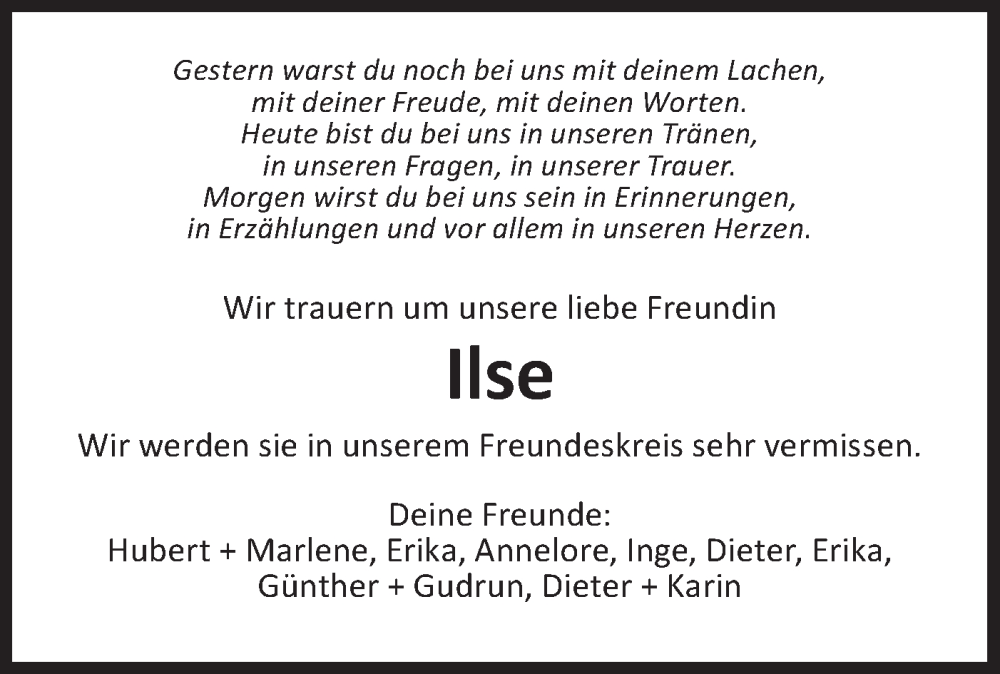 Hier finden Sie alle Traueranzeigen aus der Zeitung, die bisher für Ilse erschienen sind. Weitere Traueranzeigen, die in der Zeitung erscheinen, werden hier ebenfalls aufgelistet