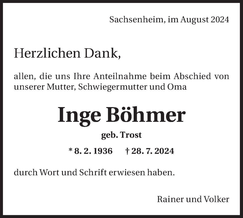 Hier finden Sie alle Traueranzeigen aus der Zeitung, die bisher für Inge Böhmer erschienen sind. Weitere Traueranzeigen, die in der Zeitung erscheinen, werden hier ebenfalls aufgelistet