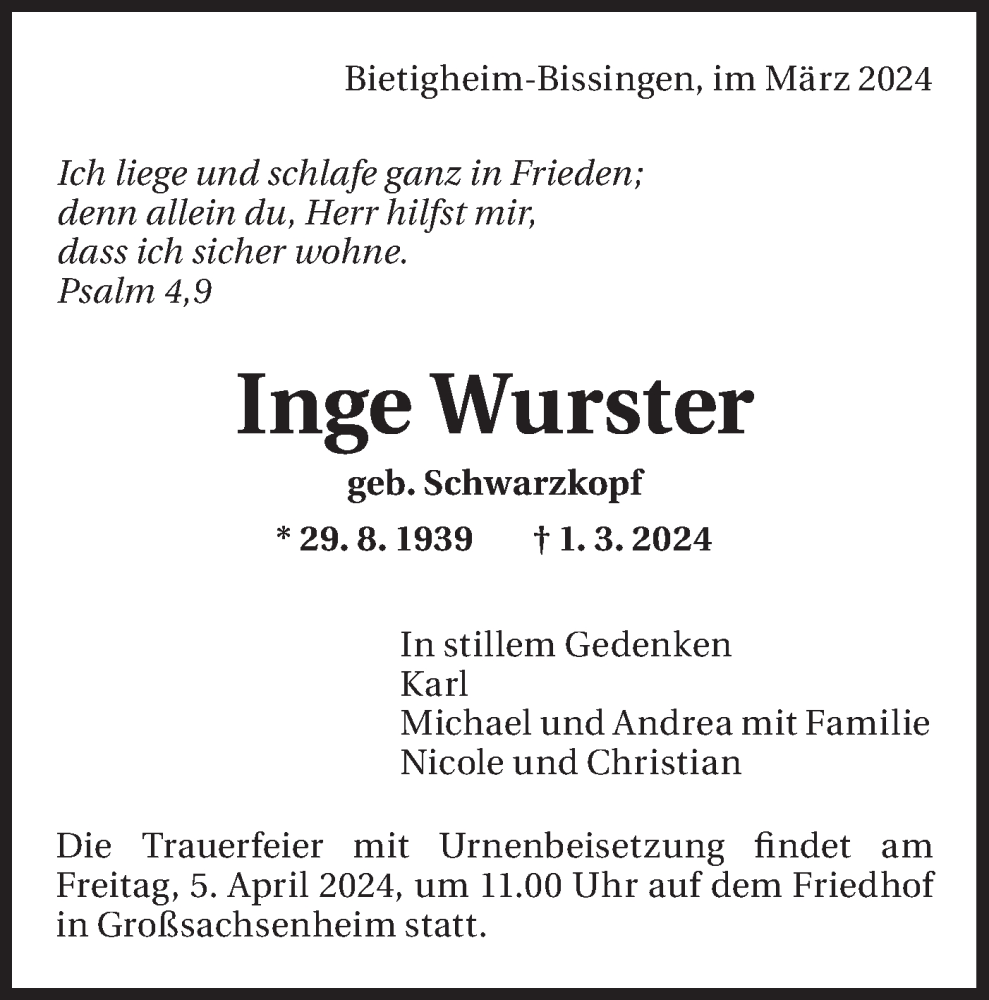 Hier finden Sie alle Traueranzeigen aus der Zeitung, die bisher für Inge Wurster erschienen sind. Weitere Traueranzeigen, die in der Zeitung erscheinen, werden hier ebenfalls aufgelistet