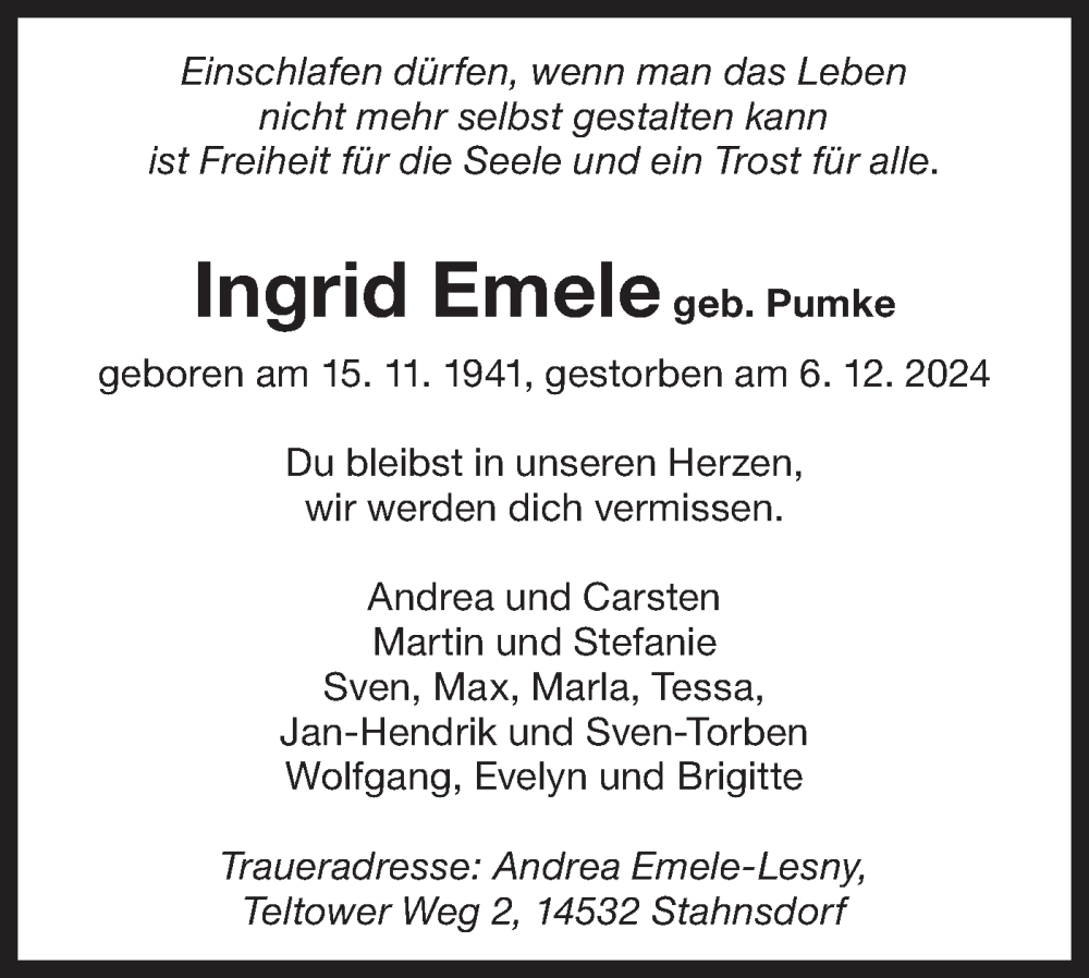 Hier finden Sie alle Traueranzeigen aus der Zeitung, die bisher für Ingrid Emele erschienen sind. Weitere Traueranzeigen, die in der Zeitung erscheinen, werden hier ebenfalls aufgelistet