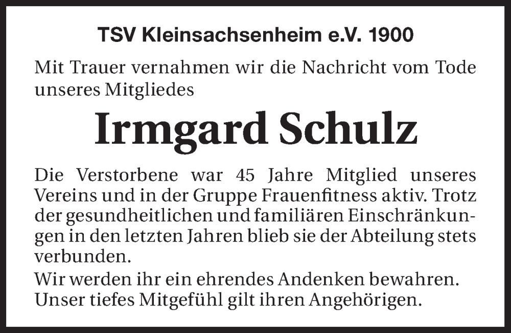 Hier finden Sie alle Traueranzeigen aus der Zeitung, die bisher für Irmgard Schulz erschienen sind. Weitere Traueranzeigen, die in der Zeitung erscheinen, werden hier ebenfalls aufgelistet