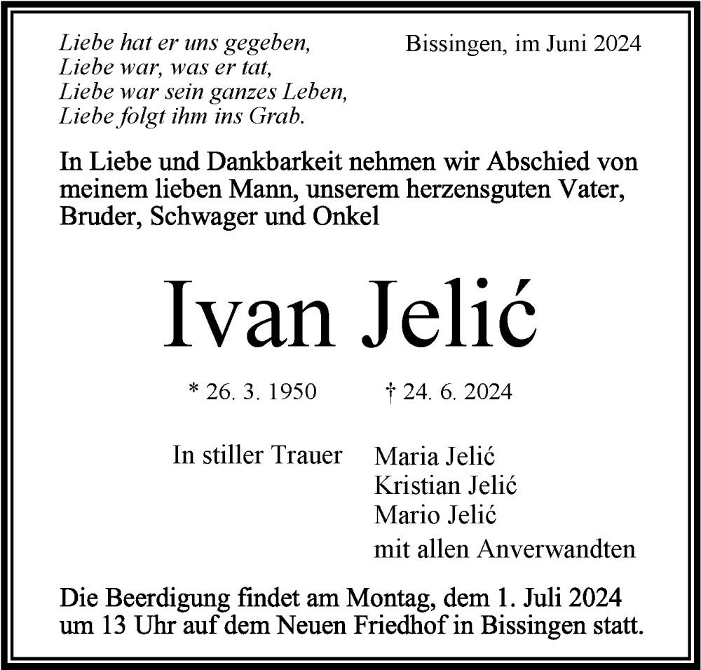 Hier finden Sie alle Traueranzeigen aus der Zeitung, die bisher für Ivan Jelic erschienen sind. Weitere Traueranzeigen, die in der Zeitung erscheinen, werden hier ebenfalls aufgelistet