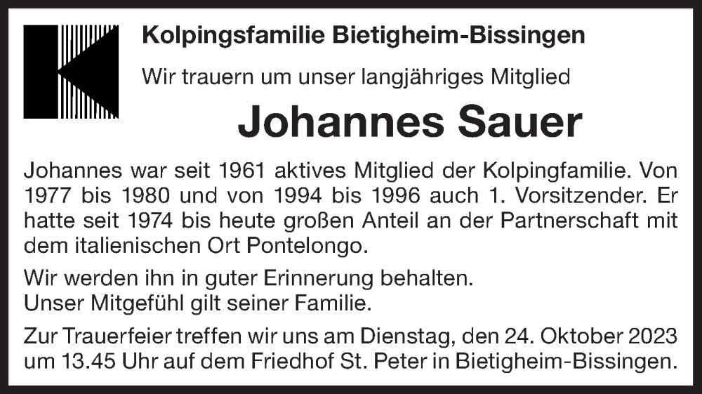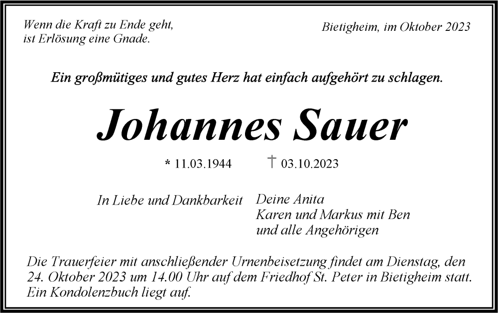 Hier finden Sie alle Traueranzeigen aus der Zeitung, die bisher für Johannes Sauer erschienen sind. Weitere Traueranzeigen, die in der Zeitung erscheinen, werden hier ebenfalls aufgelistet