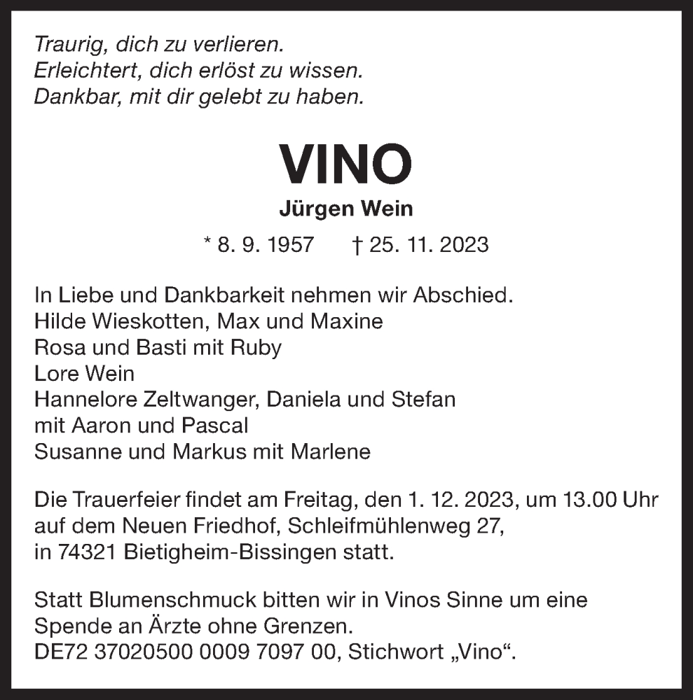 Hier finden Sie alle Traueranzeigen aus der Zeitung, die bisher für Jürgen Wein erschienen sind. Weitere Traueranzeigen, die in der Zeitung erscheinen, werden hier ebenfalls aufgelistet
