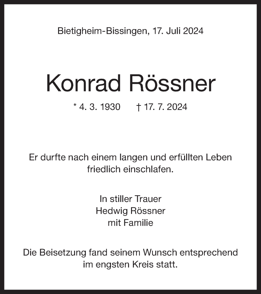 Hier finden Sie alle Traueranzeigen aus der Zeitung, die bisher für Konrad Rössner erschienen sind. Weitere Traueranzeigen, die in der Zeitung erscheinen, werden hier ebenfalls aufgelistet