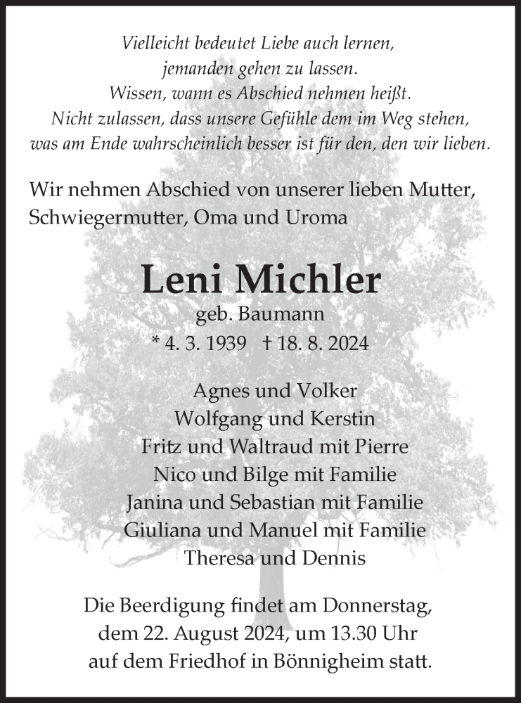 Hier finden Sie alle Traueranzeigen aus der Zeitung, die bisher für Leni Michler erschienen sind. Weitere Traueranzeigen, die in der Zeitung erscheinen, werden hier ebenfalls aufgelistet