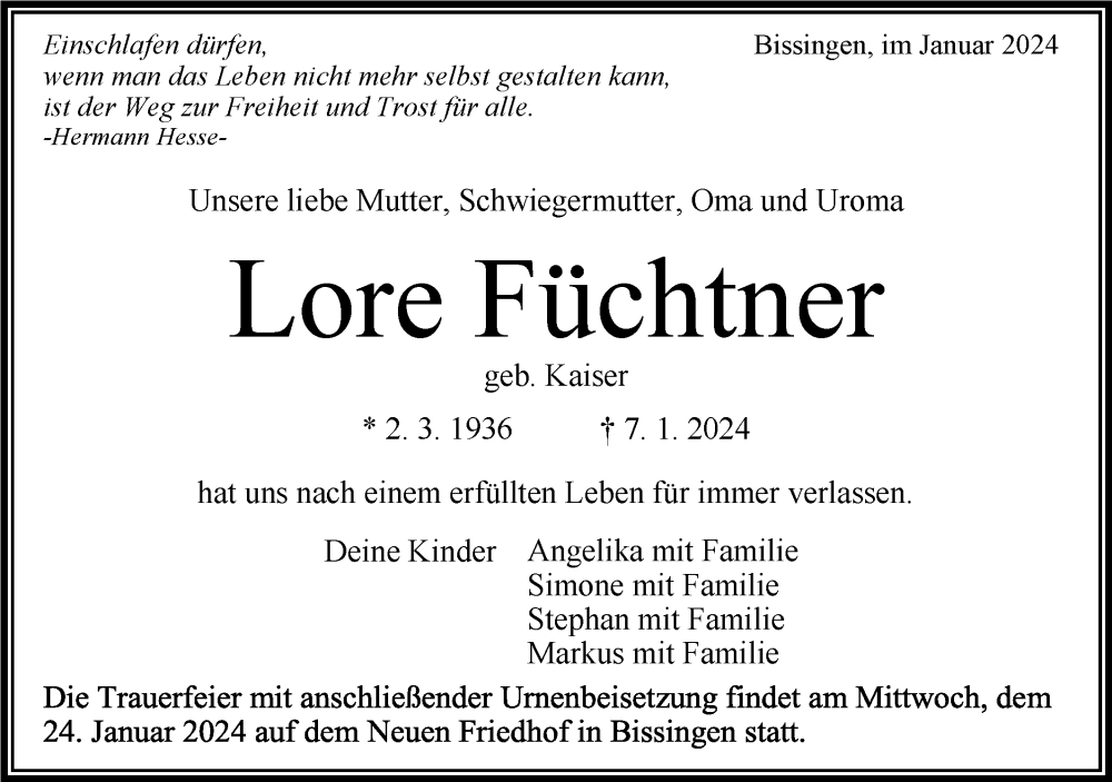 Hier finden Sie alle Traueranzeigen aus der Zeitung, die bisher für Lore Füchtner erschienen sind. Weitere Traueranzeigen, die in der Zeitung erscheinen, werden hier ebenfalls aufgelistet