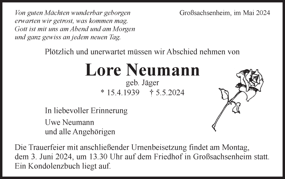 Hier finden Sie alle Traueranzeigen aus der Zeitung, die bisher für Lore Neumann erschienen sind. Weitere Traueranzeigen, die in der Zeitung erscheinen, werden hier ebenfalls aufgelistet