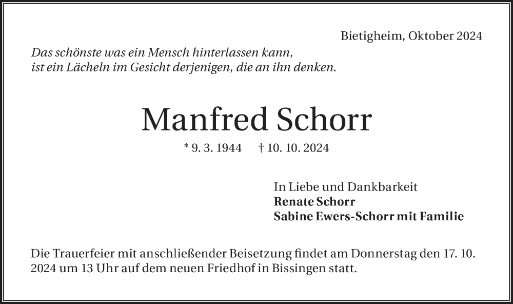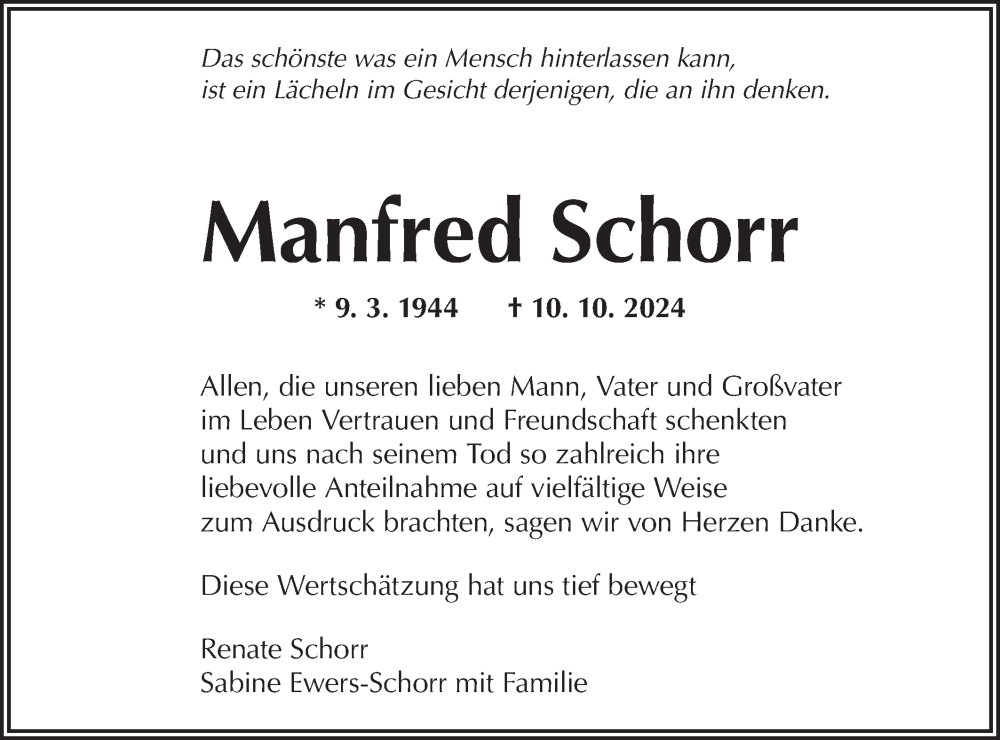 Hier finden Sie alle Traueranzeigen aus der Zeitung, die bisher für Manfred Schorr erschienen sind. Weitere Traueranzeigen, die in der Zeitung erscheinen, werden hier ebenfalls aufgelistet