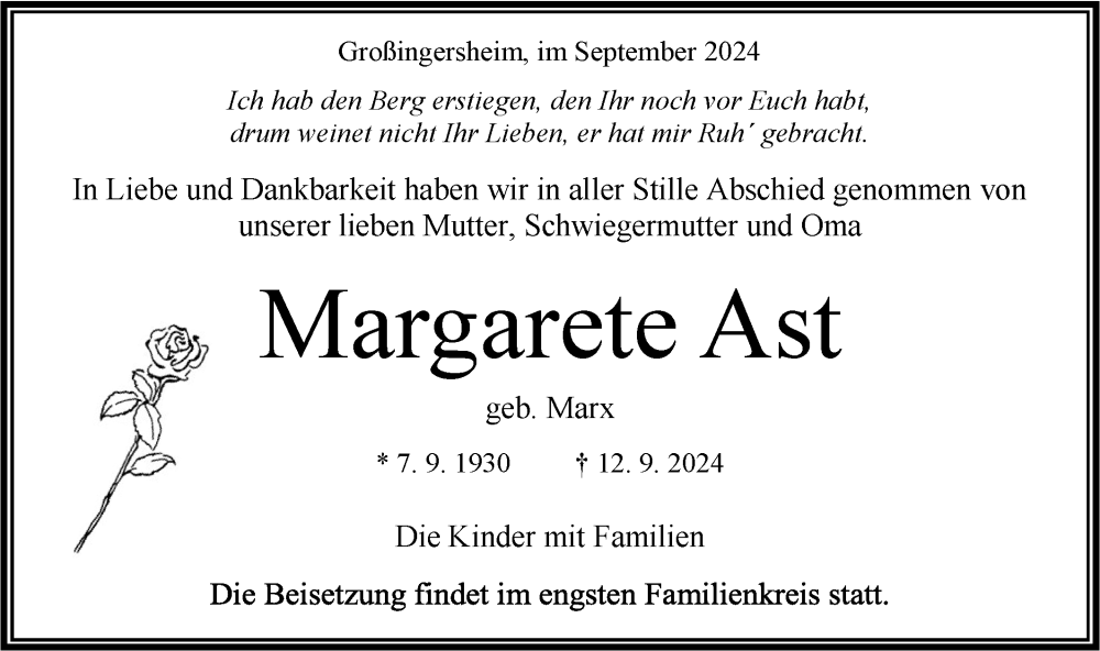 Hier finden Sie alle Traueranzeigen aus der Zeitung, die bisher für Margarete Ast erschienen sind. Weitere Traueranzeigen, die in der Zeitung erscheinen, werden hier ebenfalls aufgelistet