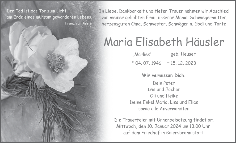 Hier finden Sie alle Traueranzeigen aus der Zeitung, die bisher für Maria Elisabeth Häusler erschienen sind. Weitere Traueranzeigen, die in der Zeitung erscheinen, werden hier ebenfalls aufgelistet