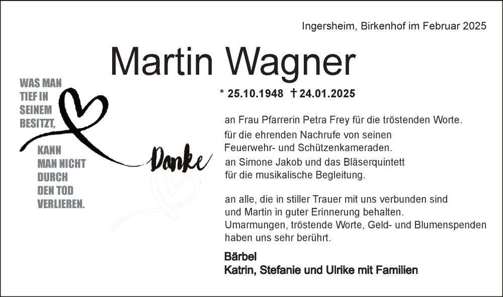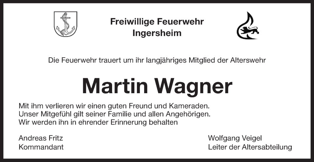 Hier finden Sie alle Traueranzeigen aus der Zeitung, die bisher für Martin Wagner erschienen sind. Weitere Traueranzeigen, die in der Zeitung erscheinen, werden hier ebenfalls aufgelistet