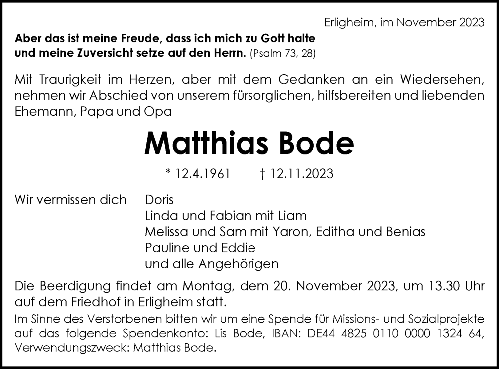 Hier finden Sie alle Traueranzeigen aus der Zeitung, die bisher für Matthias Bode erschienen sind. Weitere Traueranzeigen, die in der Zeitung erscheinen, werden hier ebenfalls aufgelistet
