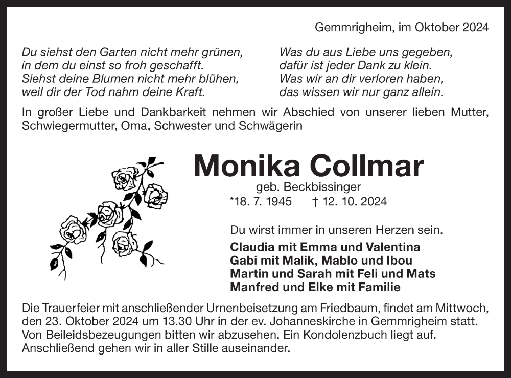 Hier finden Sie alle Traueranzeigen aus der Zeitung, die bisher für Monika Collmar erschienen sind. Weitere Traueranzeigen, die in der Zeitung erscheinen, werden hier ebenfalls aufgelistet